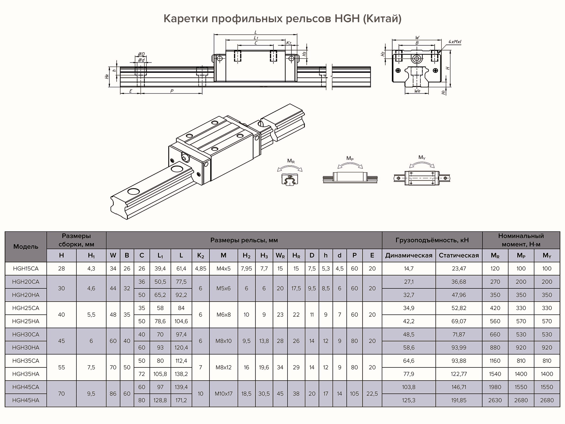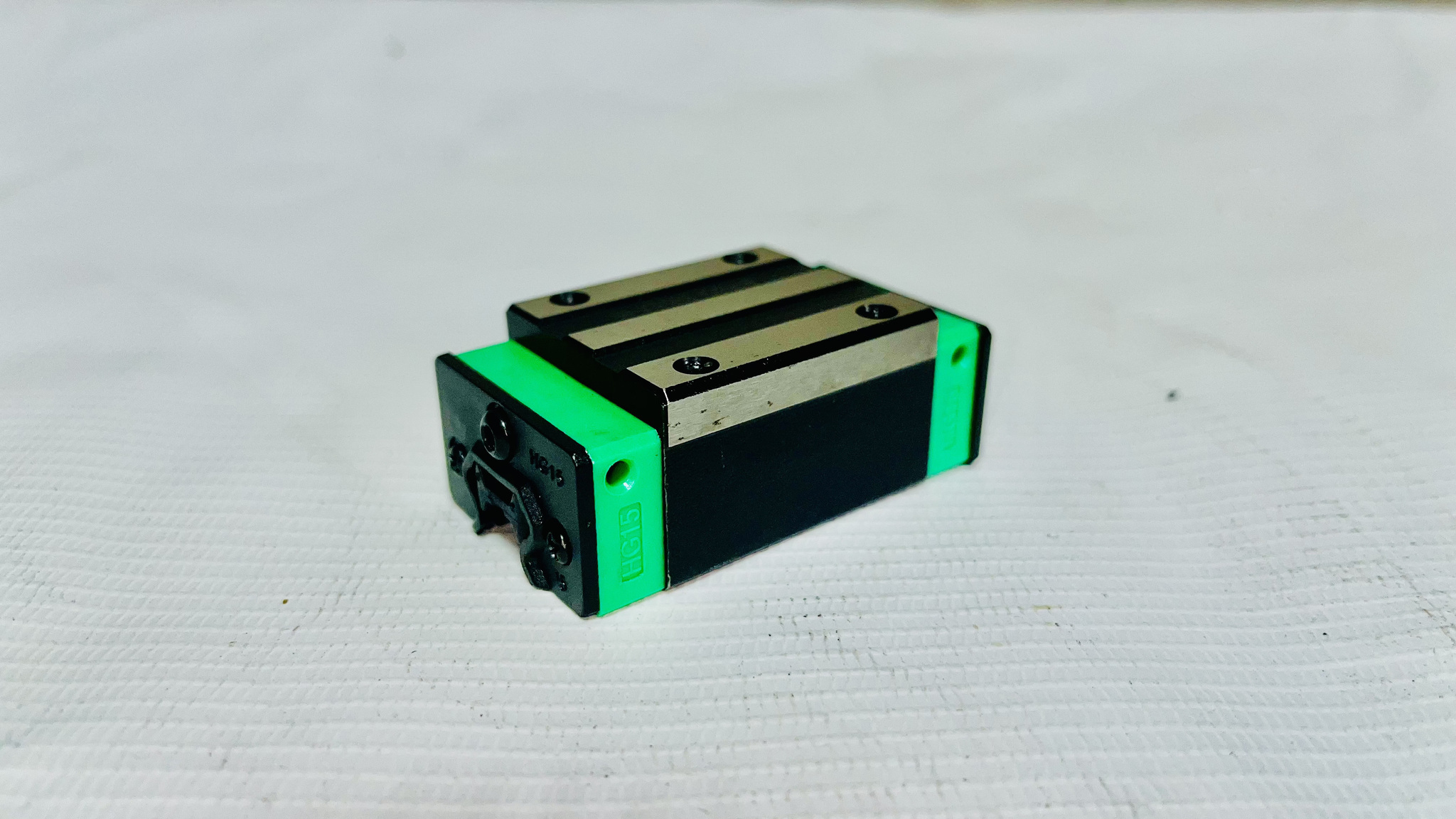 Каретка (модуль линейного перемещения) профильных рельсов HGH (Китай). Состоят из корпуса, в котором расположены 2 ряда металлических шариков, их перемещение происходит в замкнутом контуре. Для смазки предусмотрены отверстия, в которые вворачивается пресс-масленка.